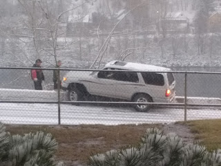 windows, watching the snow fall for 2 hours and seeing this car nearly go up and over the barrier into the river below, I cannot help but give thanks that the only problem we faced today was a bolt in our tire. One hour later, Shane gets back. There was a Canadian tire 5 miles out of town and for $30US, the biggest problem of our day is solved.